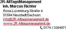 Adresse:Rosa-Luxemburg-Str. 401844Neustadt in Sachsen Branche:Baudienstleistungen www.2R-Alltagsmanagement.de info@2R-Alltagsmanagement.de Fax: Tel: 0174 3264971