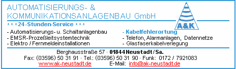 Adresse:Berghausstr. 5701844Neustadt in Sachsen Branche:Automation und Steuerungen www.ak-neustadt.de info@ak-neustadt.de Fax: 03596 503191 Tel: 03596 503190