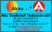 Adresse:An der Kleinbahn 902689Sohland a.d. Spree Branche:Notstromversorgung Akkumulatoren, Batterien, Solaranlagen (Solartechnik), Stromversorgungsanlagen www.akkusolar.de info@akkusolar.de Fax: 035936 41500 Tel: 035936 34377