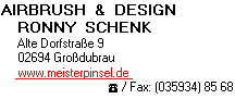 Adresse:Alte Dorfstr. 902694Großdubrau Bautzen Branche:Wandmalereien www.meisterpinsel.de ronnyschenk@meisterpinsel.de Fax: 035934 8568 Tel: 035934 8568