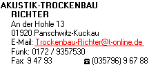 Adresse:An der Hohle 1301920Panschwitz-Kuckau Kamenz Branche:Akustik- und Trockenbau Trockenbau-Richter@t-online.de Fax: 035796 94793 Tel: 035796 96788