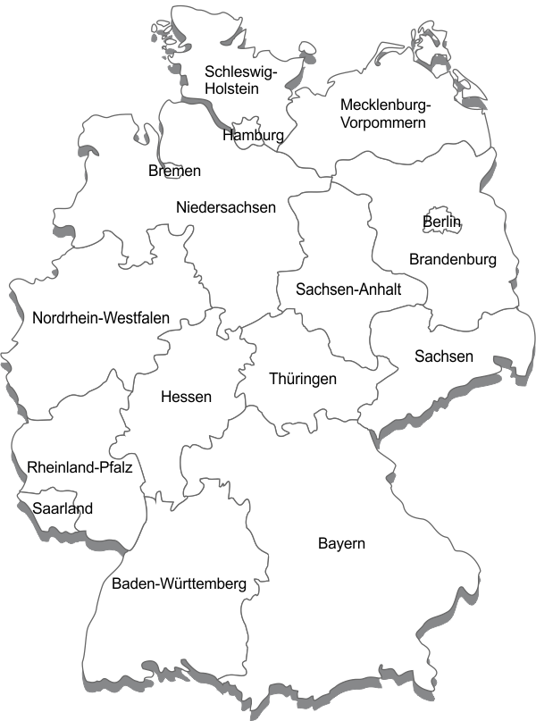 Sachsen Bayern Baden-Württemberg Rheinland-Pfalz Saarland Hessen Thüringen Sachsen-Anhalt Brandenburg Berlin Nordrhein-Westfalen Niedersachsen Bremen Mecklenburg-Vorpommern Schleswig-Holstein Hamburg